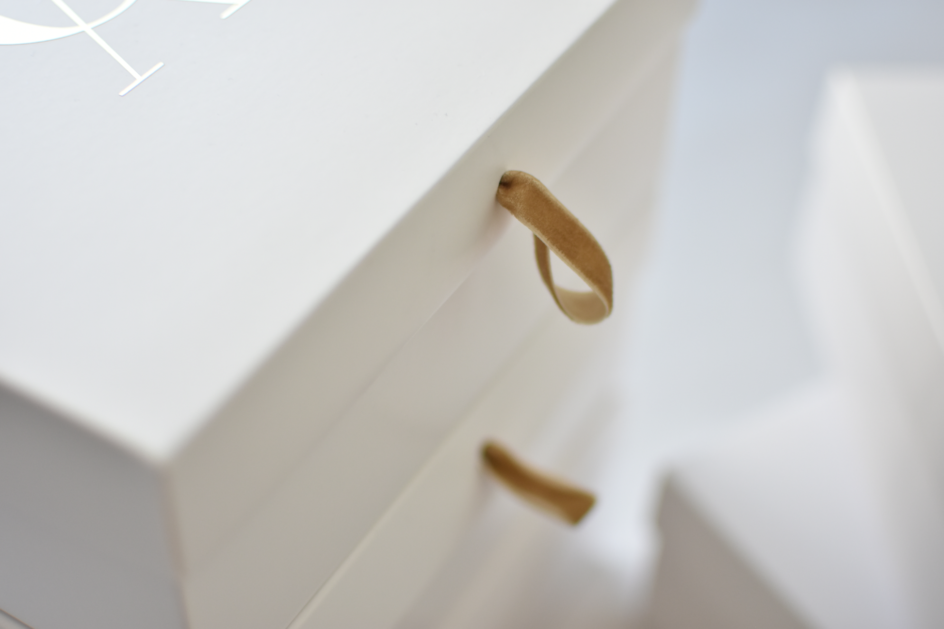Inclui nome personalizado da dama ou padrinho/madrinha ou o vosso monograma em vinil, fita e puxador em tecido, pedido com texto especial no interior da tampa, e papel seda.