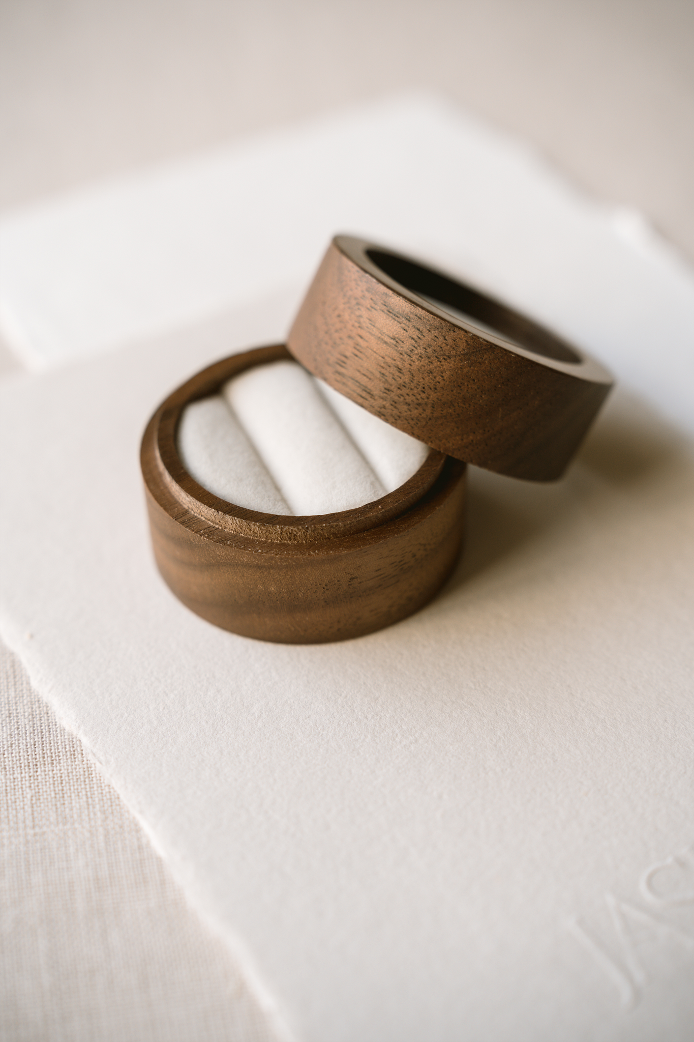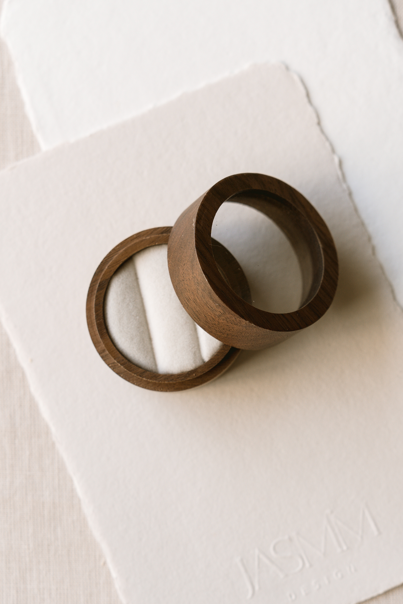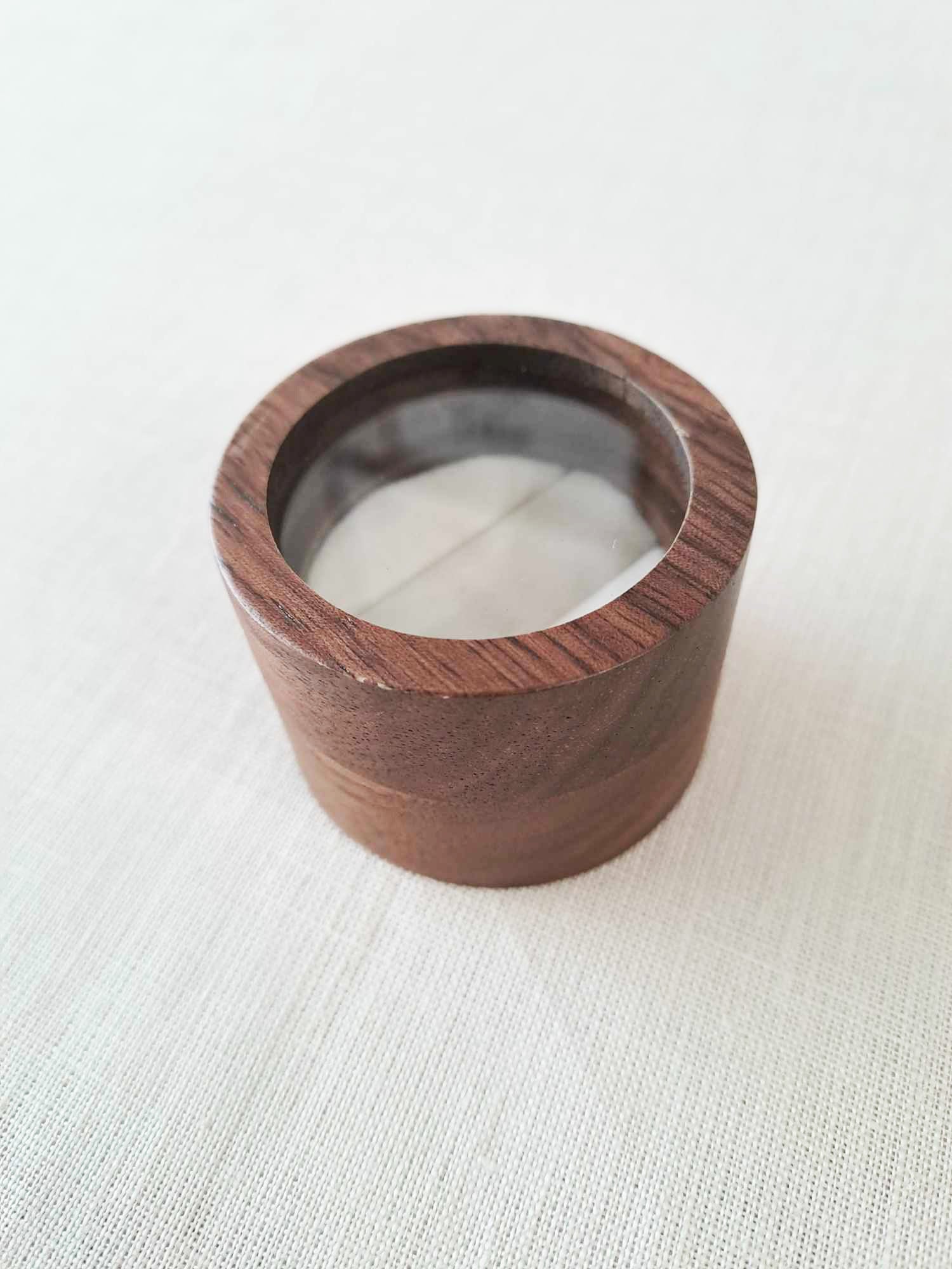 Caixa redonda em madeira, com tampo em madeira e acrílico transparente. Interior forrado a veludo.