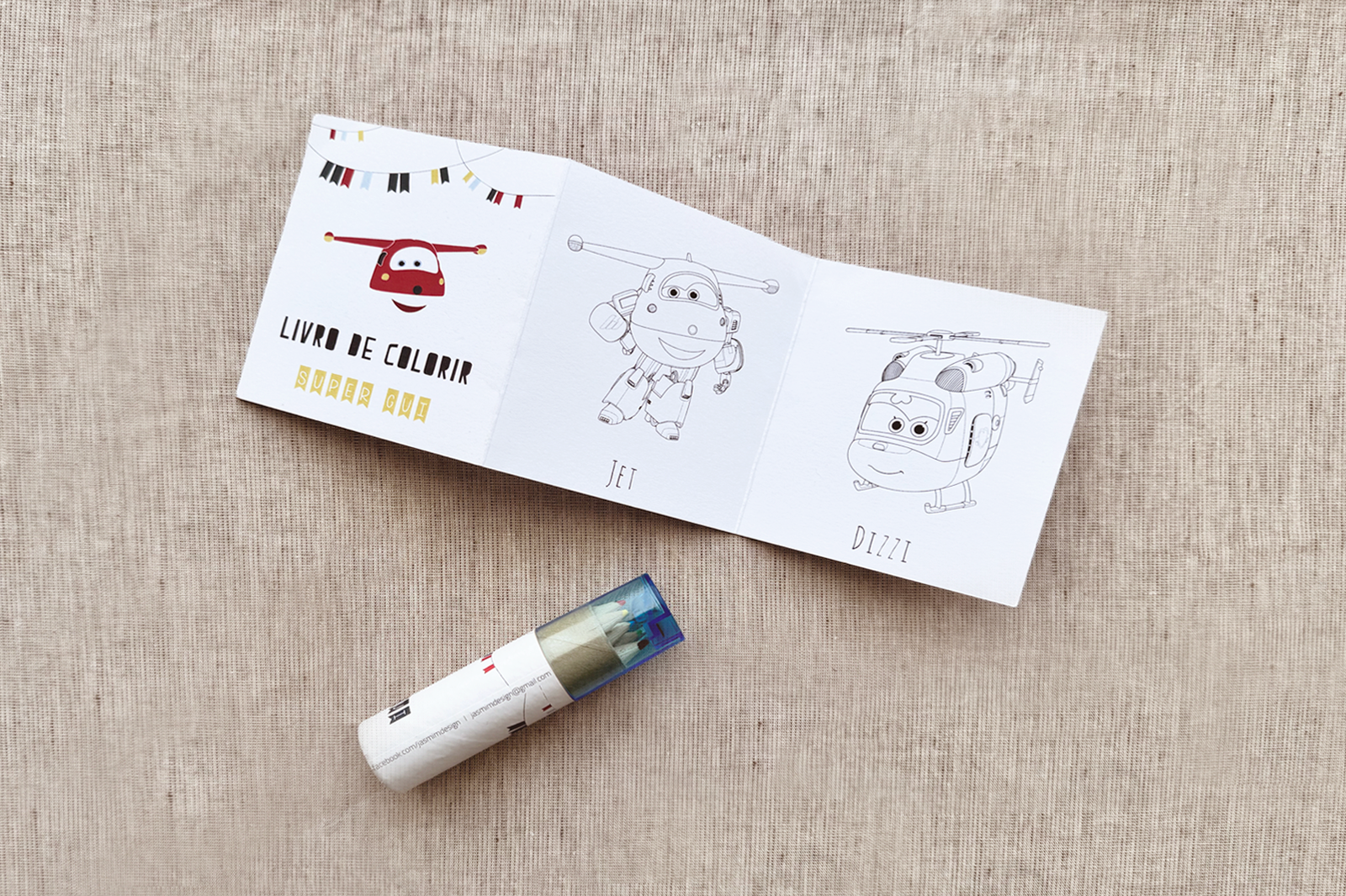 Kit lembrança infantil. Desdobrável com desenhos de Super Wings + tubo de lápis de cor com etiqueta personalizada.