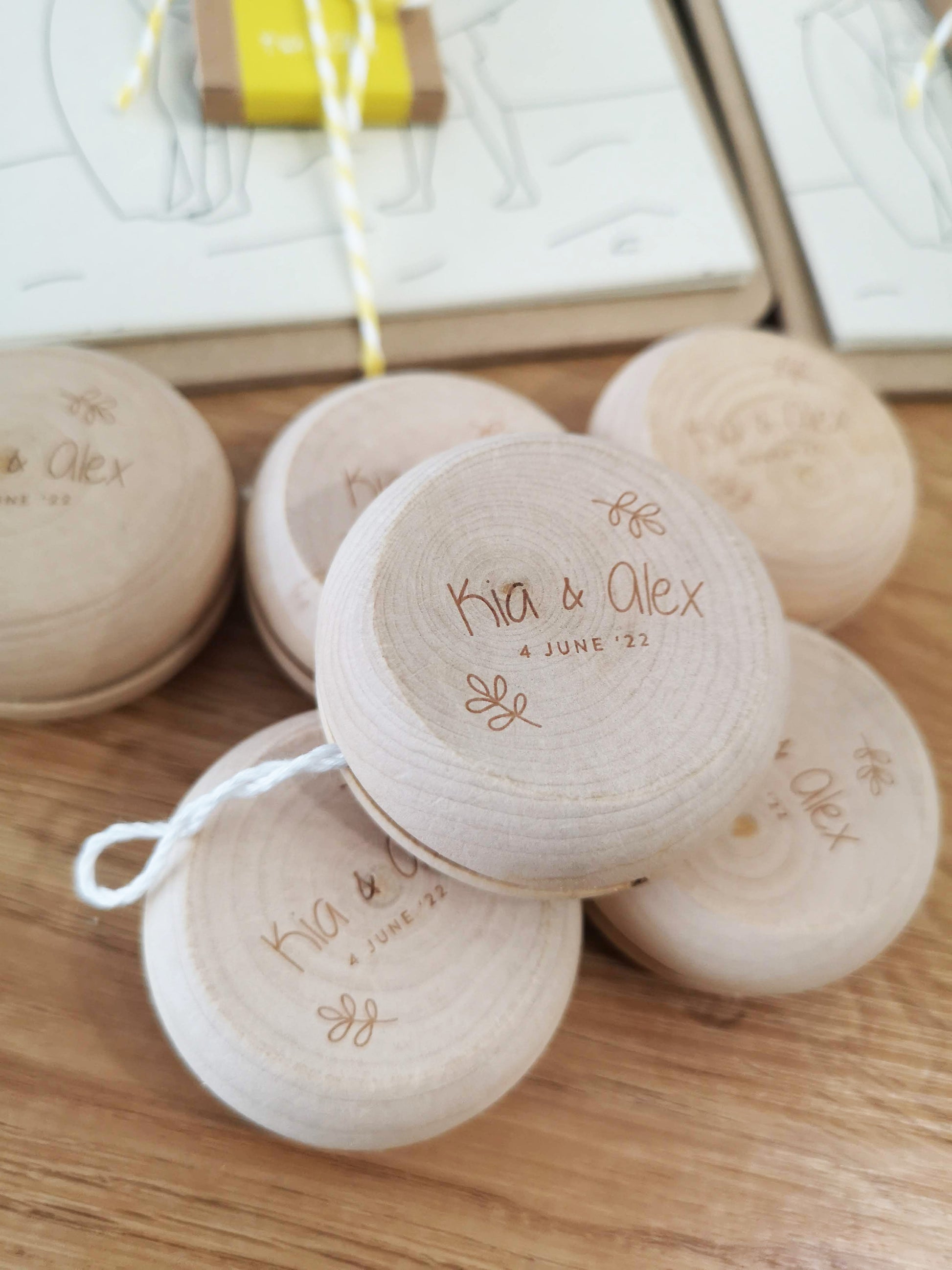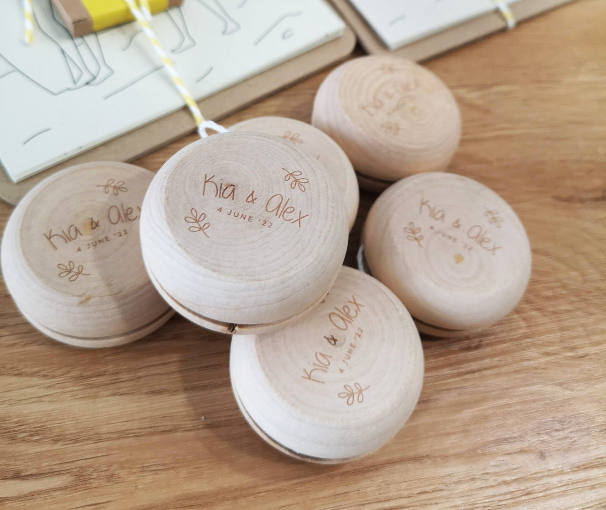 O Iô-Iô em madeira, gravado a laser, é mais do que um simples objeto; É uma pequena jóia que mescla tradição e modernidade, criando uma recordação para crianças encantadora para celebrar o casamento. Com um design refinado e feito em madeira de qualidade, como maple ou cerejeira, este Iô-Iô destaca-se pela gravação personalizada a laser, que adiciona um toque único com nomes e data.